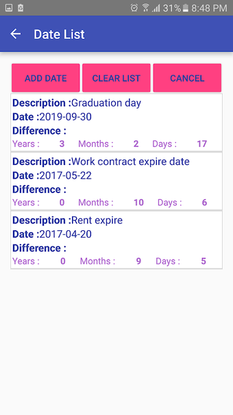 日期计算器的主要功能包括计算两个日期之间的差异,将日期和差异保存在更新的列表中,以及计算从今天的日期开始过去或未来的天数、月数和年数。这使它成为一个多功能工具,可以用于计算年龄、合同到期日、婚礼日期、学习时长、租赁到期日等各种用途。